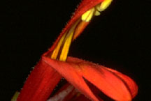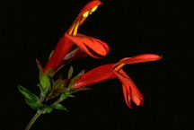 Heart-leaved Keckiella Keckiella cordifolia (Scrophulariaceae) Keckiella cordifolia has heart-shaped leaves. This is reflected in the species name, cordifolia, or heart leaf. The name Keckiella honors David D. Keck (1903- ). He and Philip A. Munz authored a major treatise entitled A California Flora in 1959. This species can grow to a height of three meters. Its open drooping habit often gives it an ungainly appearance. The deep red flowers are borne in compact terminal clusters. The stalk or pedicel of each flower can sometimes be twisted on the long arching branches in a way that makes for an upside-down orientation. This inversion created by twisting of the pedicel is called resupinate. DISTRIBUTION: In forest and chaparral from the southern outer South Coast Ranges to SW Calif.; < 1200 m. |