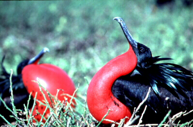 Courting male Great frigate birds (Fregata minor) on Tower Island