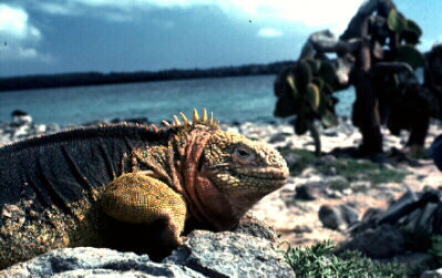 Endemic Galapagos land iguanas (Conolophus subcristatus) on Isla Plazas feed on Opuntia cactus leaves (in background)