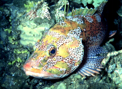 Deepwater scorpionfish (Pontinus sp.) and lace corals at 150 meters below the Corona del Diablo